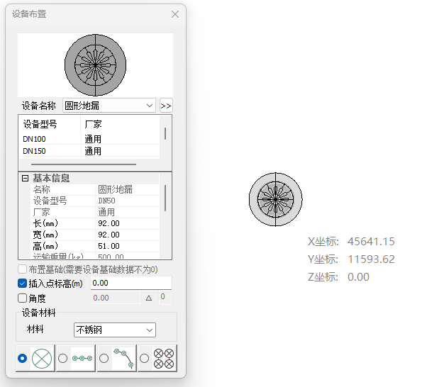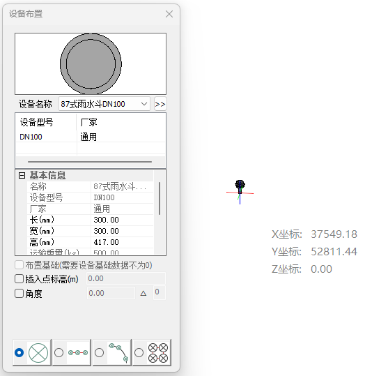地漏布置界面如图所示,在图示界面中选择地漏型号,确定地漏布置点,将地漏旋转到需要的角度即可完成布置。