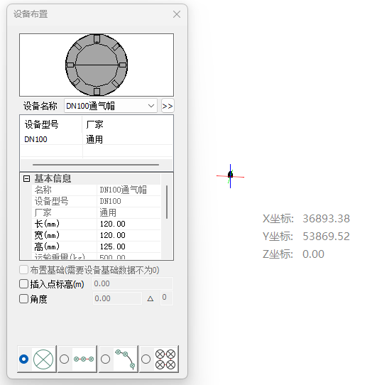 通气帽布置界面如图所示,在图示界面中选择通气帽型号,确定通气帽布置点,将通气帽旋转到需要的角度即可完成布置。