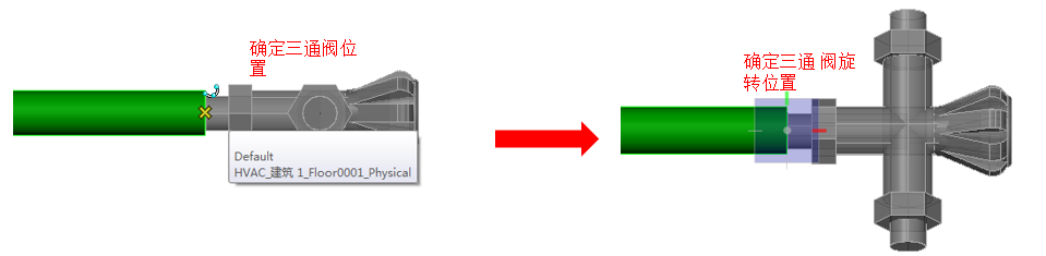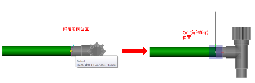 【角度】移动鼠标确定阀门绕管道旋转的相对位置,[↑][↓]键切换角度旋转步长,如图所示。