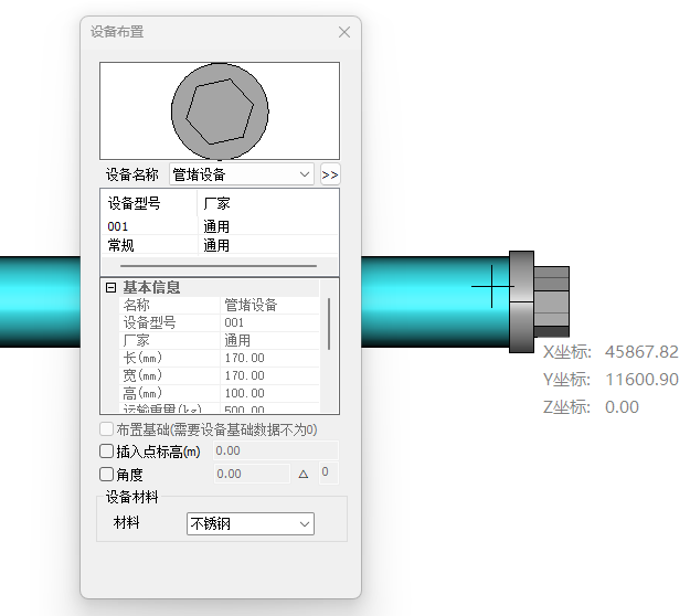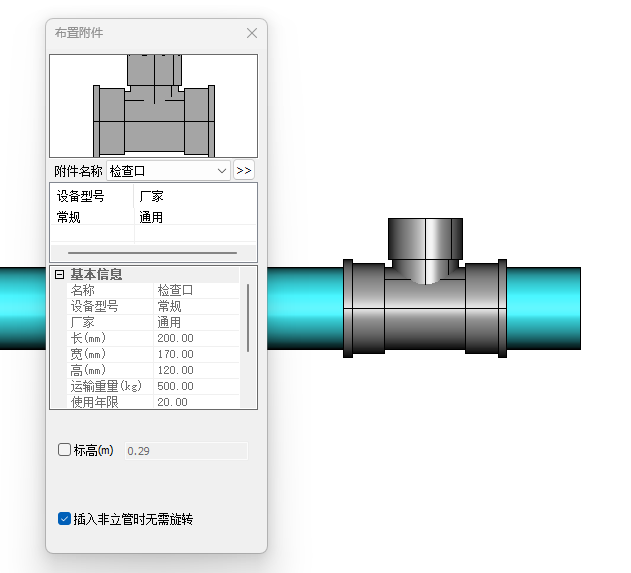 检查口布置界面如图所示,检查口只能布置在管道上或管道末端,因此无需输入标高,选取布置点后,可以绕管道中心线旋转阀门方向,以使阀柄放置到适合操作的方向。