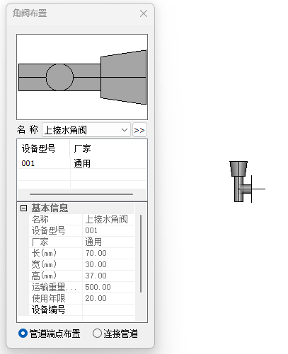 【连接布置】选择连根管道用角阀连接,如图。