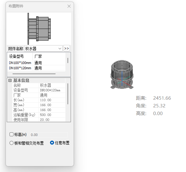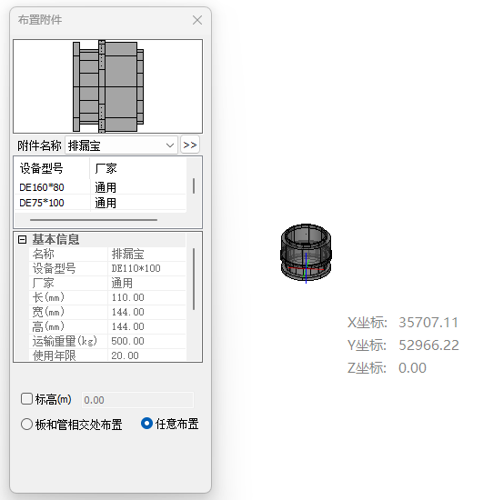 排漏宝布置界面如图排漏宝布置界面。所示,在图示界面中选择排漏宝型号,确定排漏宝布置点,将排漏宝旋转到需要的角度即可完成布置。