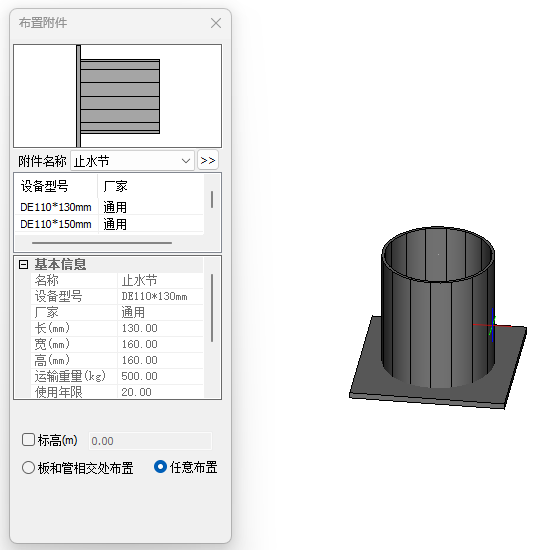止水节布置界面如图所示,在图示界面中选择止水节型号,确定止水节布置点,将止水节旋转到需要的角度即可完成布置。