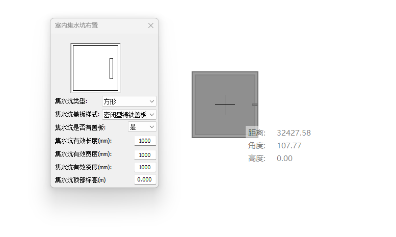 集水坑布置界面如所示,在图示界面中选择集水坑类型、集水坑盖板样式、是否设置盖板、及集水坑长、宽、高、顶部标高等参数,确定集水坑布置点,将集水坑旋转到需要的角度即可完成布置。