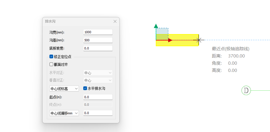 【修正定位点】在非勾选状态下,组合框内的设置无效,根据鼠标实际点定位排水沟;在勾选状态下,会根据组合框内的设置对鼠标点进行修正,利用修改后的点定位排水沟。在勾选“修正定位点”状态下,所绘制管道标高取排水沟绘制界面中的标高。