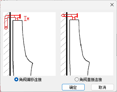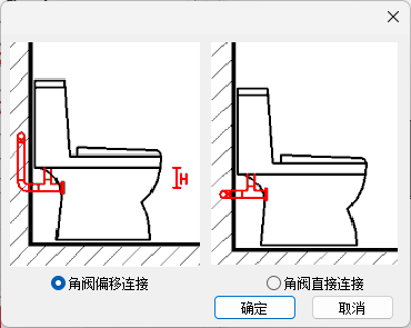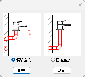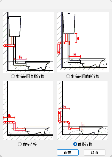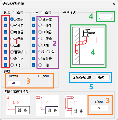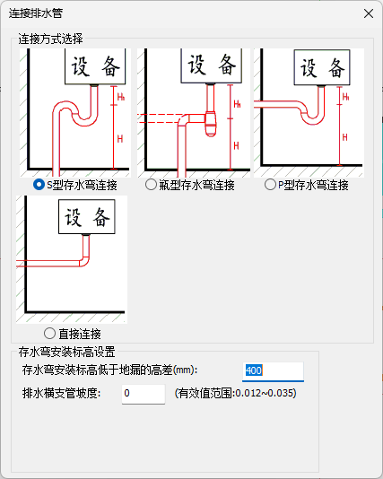 卫浴连接界面如图所示,在界面中可设置连接方式,需要连接的设备类型,连接的距离或者标高参数以及连接需要的设备或附件的选择。