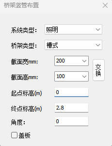 点击【建模】-【桥架】-【桥架布置】-【竖直桥架布置】,电缆沟布置界面如图表所示,在界面中可对电缆沟尺寸进行设置和修改。同时可以设置电缆沟布置标高和电缆沟偏心距离等绘制参数。