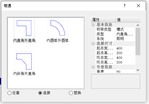 以桥架弯头为例: 界面如所示,可在左侧图示列表中选择弯头类型,右侧列表中为所选弯头参数。