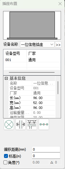 在绘图区选取插座布置定位点,左键点取确定后,根据需要旋转插座方向,再次单击鼠标左键,完成插座布置。任意布置时,可以根据需要确定固定角度或者固定标高布置。“偏移距离”选项可以调整插入点相对于插座初始基点的位置。