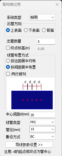 【线管布置方式】:按照图例所示,配合[间距]选项,线管在配电箱表面的分布情况, 可以同时勾选两行排列,进行布置。