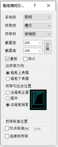 点击【建模】-【强电设备】-【引出桥架】,布置界面如图所示。配电箱引出桥架功能用于对选定的配电箱按照参数设置的方式引出桥架。