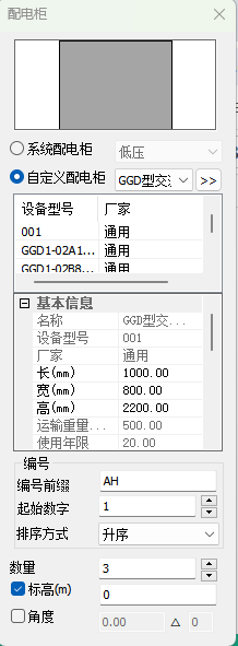 通过对“编号前缀”、“起始数字”及“排序方式”进行设置,可以灵活的对配电柜编号进行设置。