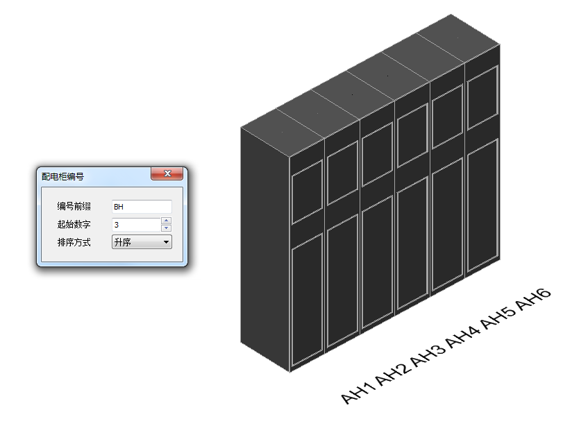 2.输入编号前缀“AH”,起始数字为3,排序方式选择升序。首先点击起始配电柜AH3,然后点击终止配电柜AH6,如图所示。修改结果如图所示,AH3AH6修改为BH3BH6。