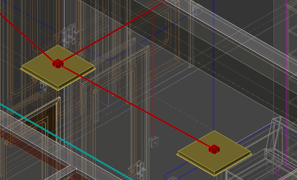 【直接连接】:在模型中点击一个设备,当鼠标选择第二个设备后,无需点选鼠标右键,软件会自动选择距离最近的且无线管连接的两个接线盒的口进行连接(灯具无接线盒时会按照选择添加接线盒,默认添加双管口线盒),如有多个设备则直接选择第三、第四等等即可。