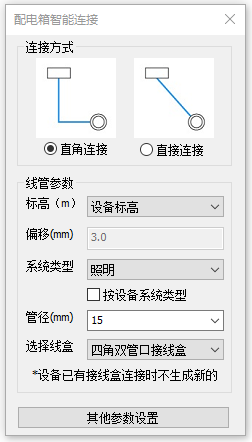 设备-配电连接可选参数为【线管系统类型】,【线管管径】 ,【线管数据】,【接线盒类型】和【水平线管标高】。
