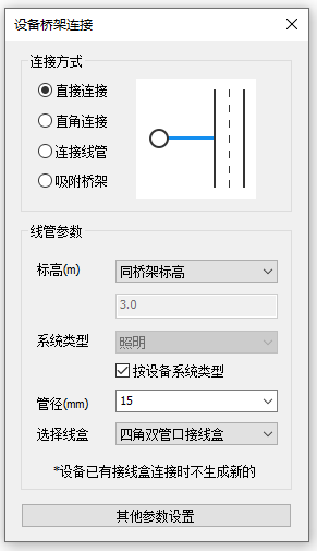 设备点位连接功能有四种连接方式,分别是直接连接、直角连接、连接线管和吸附桥架连接。
