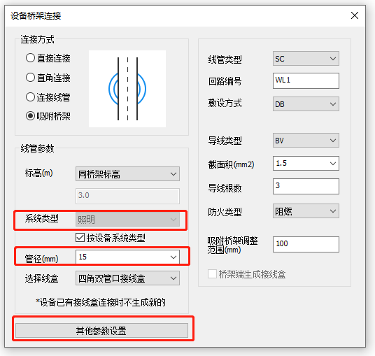 【吸附桥架】:在桥桥架边线范围内的设备,可直接将标高吸附到桥架底标高进行连接。连接时提示是否将设备移动到桥架标高。当设备插入点在桥架范围外时,无法进行连接。