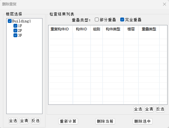 目录 搜索 展开 首页乘车路线版权与商标说明免责声明通用功能链接软件答疑与交流更新说明20262026 R1.22026 R1.12026 R1.020252025 R2.12025 R2.02025 R1.22025 R1.120242024 R2.22024 R2.12024 R2.02024 R1.42024 R1.32024 R1.22024 R1.12024 R1.020232023 R2.42023 R2.32023 R2.22023 R2.02023 R1.12023 R1.52023 R1.42023 R1.32023 R1.22023 R1.020222022 R3.12022 R3.02022 R2.32022 R2.22022 R2.12022 R2.02022 R1.42022 R1.32022 R1.22022 R1.0应用环境运行环境启动界面操作界面快速访问工具栏视图盒子模型操作视图区命令提示行项目浏览器属性面板多窗口显示设置视图工具条光照亮度三维坐标捕捉设置暖通专业设计暖通专业工程设置风系统设置水系统设置风管默认连接设置风管建模设置水管建模设置水管件默认设置风管材料设置水管材料设置地暖盘管材料设置二维设置空调风系统风管绘制风管编辑风立管风管连接件风管对齐风口布置风口连接静压箱换气扇、风机挡烟垂壁空调水系统水管绘制布空调立管多管绘制水管连接水管编辑风盘连水多联机系统室内机室外机多联机连管多联机分歧管采暖系统布散热器立干连接散立连接散干连接散散连接自动盘管手绘盘管盘管打断盘管合并布分集水器连分集水器设备及附件布置风盘水泵常用基础通用组合空调风阀消声器风管软连接水阀仪表角阀三通阀水管软接头组合阀暖通识图建模DWG编辑风管识图翻模水管识图建模风口识图翻模识别水阀仪表暖通标注风管标注风口标注管线文字水管标注立管标注出入户管标注管道坡度标注引出标注给排水专业设计给排水专业工程设置给排水系统设置管件默认设置给排水建模设置水管材料设置二维设置管道建模水管绘制多管绘制布水立管水管连接水管编辑水管连接件管道附件布置自动连接标准连接设备布置与连接卫浴布置卫浴连接水箱水泵基础集水坑排水沟室外设备通用消防系统建模消火栓系统布置与连接自动喷淋系统布置与连接气体灭火建模计算灭火器建模给排水识图建模消火栓识图建模消防喷淋系统水管识图建模水阀识图建模给排水标注管线文字水管标注立管标注出入户管标注喷头定位标注管道坡度标注引出标注电气专业设计电气专业工程设置线管系统设置桥架系统设置桥架默认连接件设置线管建模设置线管材料设置二维设置线管/桥架绘制桥架/线槽桥架布置桥架分支选择竖直桥架布置多层桥架桥架连接线管/导线线管布置竖直线管线管连接线管空间连接导线布置线管对齐强电系统设备灯具开关插座接线盒通用设备布置楼梯间布置防雷接地导体布置防雷布置接地布置弱电系统设备温烟感布置消防报警弱电通用综合布线变配电设备配电箱布置引出线管引出桥架配电箱系统检索变压器配电柜设备基础母线槽布置母线槽连接电缆沟设备连接设备连接连配电箱接口连接连接桥架电气专业计算区域照度计算防雷计算房间照度计算电气负荷计算电流计算负荷计算查看报告书电气专业标注引线布置灯具标注桥架标注导线标注标配电箱标水暖设备标导线数&根数修改设备标注回路标注&回路识别电气识图建模DWG处理工具电气设备点位桥架翻模设备库编辑设备库管理新建设备专业信息添加拆开设备整体缩放导入revit族组合设备库导入模型编辑过滤选择增强过滤器检查分支编辑水平设备标高分支标高分支选择坡度调整设备替换设备编号楼层归属删除重复拾取/刷新属性测量长度面积标高坐标支吊架布置支吊架布置支吊架延管拷贝支吊架沿线拷贝支吊架编号管线综合碰撞检查碰撞检查碰撞结果碰撞报告书管道编辑水暖空间搭接水暖局部调整线管局部调整桥架升降调整间距调整水管标准连接管道合并/打断水管对齐通用对齐管综平面图三维标注局部剖切专业协同合并工程净高分析净高设置净高平面净高检查水暖提资开洞提资任意布洞自动开洞开洞设置取消洞口开洞列表布置套管云协同材料统计材料统计统计结果清单生成清单样式清单结果支吊架统计模型审查审查流程全局属性智能审查通用工具设可见性查找构件选择过滤增强过滤测量工具基本建模模板标高机制机电专业标高机制构件复制 暂无相关搜索结果! 删除重复 点击【编辑】-【其他】-【删除重复】,重叠构件删除处理界面如图所示。 功能说明 [重叠构件判断标准] 有一个接口重叠即认为两个构件重叠(不一定完全重叠)。 [列表信息] 两个构件重叠,只列出其中一个构件的ID。 [自动定位到重复构件] 勾选时,切换列表行,视图会自动定位到重叠位置。 [重新计算] 启动命令弹出对话框后,列表会保留上次的计算和处理结果,点击[重新计算]才会根据最新的模型得到最新重叠结果。 [删除当前] 用于删除列表中当前行构件。 [删除所有] 用于删除列表中所有构件。