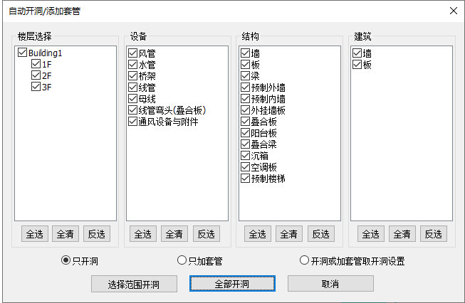 【全部开洞】根据界面所选的机电管道以及建筑结构专业构件,只要在所选楼层范围内的实体,将全部自动开洞