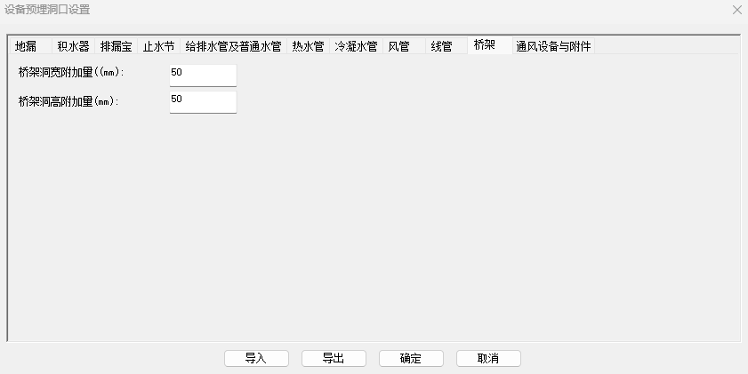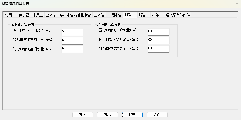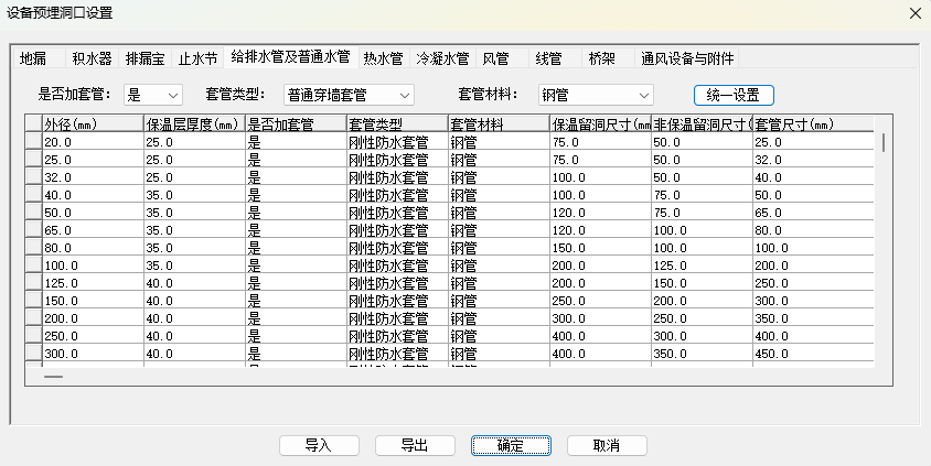 1.先执行“开洞设置命令”,在设置中选择不同类型管道的不同管径情况下是开洞或者生成套管,开洞设置包括是否生成套管,套管类型与材质,洞口与套管尺寸,洞口自动合并条件等。