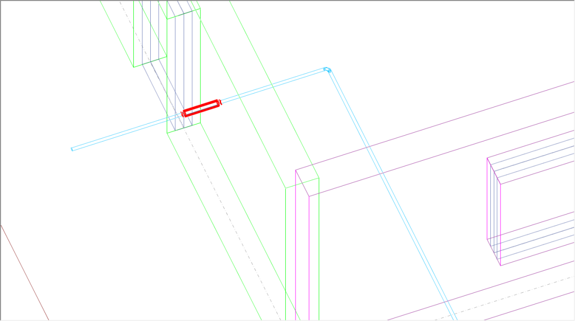 3.选择范围开洞(或生成套管):如图中模型,若只对靠左边的墙面上的管道开洞,可用“选择范围开洞”的操作方式,点选图面上的两个点(两个点需要将管道包含进去,不用考虑标高)后右键确认,通过线框模式可以看出,命令则执行完毕只对左边墙面的管道上进行了开洞(或生成了套管)。