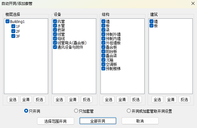 【楼层选择】以建筑楼层为基准,列出所有楼层,仅选中的楼层参与开洞计算。。