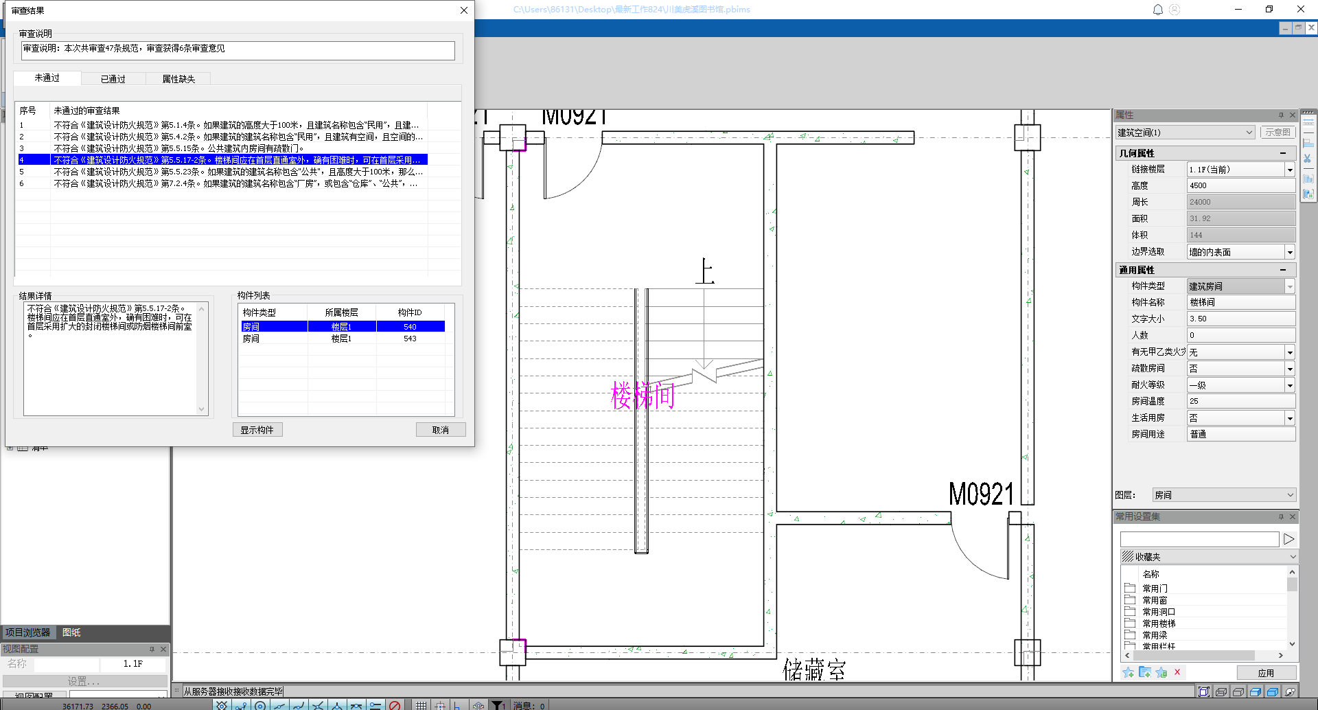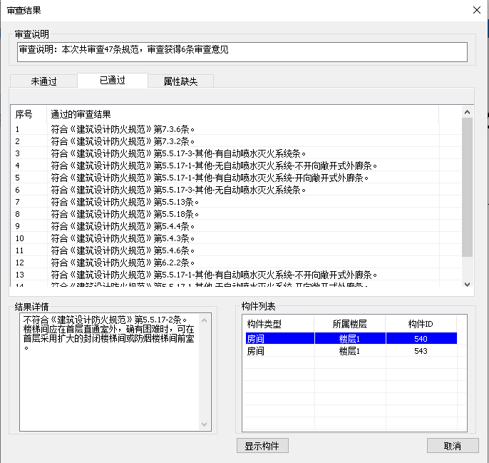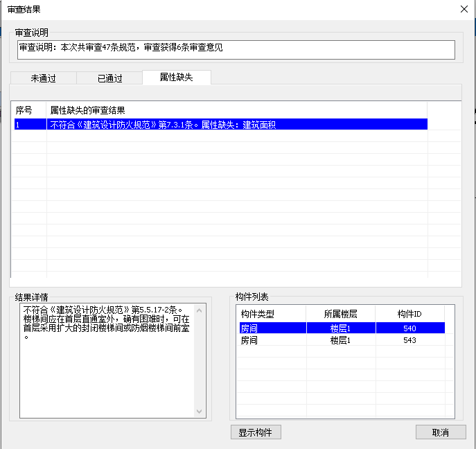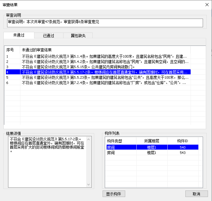 目录 搜索 展开 首页乘车路线版权与商标说明免责声明通用功能链接软件答疑与交流更新说明20262026 R1.22026 R1.12026 R1.020252025 R2.12025 R2.02025 R1.22025 R1.120242024 R2.22024 R2.12024 R2.02024 R1.42024 R1.32024 R1.22024 R1.12024 R1.020232023 R2.42023 R2.32023 R2.22023 R2.02023 R1.12023 R1.52023 R1.42023 R1.32023 R1.22023 R1.020222022 R3.12022 R3.02022 R2.32022 R2.22022 R2.12022 R2.02022 R1.42022 R1.32022 R1.22022 R1.0应用环境运行环境启动界面操作界面快速访问工具栏视图盒子模型操作视图区命令提示行项目浏览器属性面板多窗口显示设置视图工具条光照亮度三维坐标捕捉设置暖通专业设计暖通专业工程设置风系统设置水系统设置风管默认连接设置风管建模设置水管建模设置水管件默认设置风管材料设置水管材料设置地暖盘管材料设置二维设置空调风系统风管绘制风管编辑风立管风管连接件风管对齐风口布置风口连接静压箱换气扇、风机挡烟垂壁空调水系统水管绘制布空调立管多管绘制水管连接水管编辑风盘连水多联机系统室内机室外机多联机连管多联机分歧管采暖系统布散热器立干连接散立连接散干连接散散连接自动盘管手绘盘管盘管打断盘管合并布分集水器连分集水器设备及附件布置风盘水泵常用基础通用组合空调风阀消声器风管软连接水阀仪表角阀三通阀水管软接头组合阀暖通识图建模DWG编辑风管识图翻模水管识图建模风口识图翻模识别水阀仪表暖通标注风管标注风口标注管线文字水管标注立管标注出入户管标注管道坡度标注引出标注给排水专业设计给排水专业工程设置给排水系统设置管件默认设置给排水建模设置水管材料设置二维设置管道建模水管绘制多管绘制布水立管水管连接水管编辑水管连接件管道附件布置自动连接标准连接设备布置与连接卫浴布置卫浴连接水箱水泵基础集水坑排水沟室外设备通用消防系统建模消火栓系统布置与连接自动喷淋系统布置与连接气体灭火建模计算灭火器建模给排水识图建模消火栓识图建模消防喷淋系统水管识图建模水阀识图建模给排水标注管线文字水管标注立管标注出入户管标注喷头定位标注管道坡度标注引出标注电气专业设计电气专业工程设置线管系统设置桥架系统设置桥架默认连接件设置线管建模设置线管材料设置二维设置线管/桥架绘制桥架/线槽桥架布置桥架分支选择竖直桥架布置多层桥架桥架连接线管/导线线管布置竖直线管线管连接线管空间连接导线布置线管对齐强电系统设备灯具开关插座接线盒通用设备布置楼梯间布置防雷接地导体布置防雷布置接地布置弱电系统设备温烟感布置消防报警弱电通用综合布线变配电设备配电箱布置引出线管引出桥架配电箱系统检索变压器配电柜设备基础母线槽布置母线槽连接电缆沟设备连接设备连接连配电箱接口连接连接桥架电气专业计算区域照度计算防雷计算房间照度计算电气负荷计算电流计算负荷计算查看报告书电气专业标注引线布置灯具标注桥架标注导线标注标配电箱标水暖设备标导线数&根数修改设备标注回路标注&回路识别电气识图建模DWG处理工具电气设备点位桥架翻模设备库编辑设备库管理新建设备专业信息添加拆开设备整体缩放导入revit族组合设备库导入模型编辑过滤选择增强过滤器检查分支编辑水平设备标高分支标高分支选择坡度调整设备替换设备编号楼层归属删除重复拾取/刷新属性测量长度面积标高坐标支吊架布置支吊架布置支吊架延管拷贝支吊架沿线拷贝支吊架编号管线综合碰撞检查碰撞检查碰撞结果碰撞报告书管道编辑水暖空间搭接水暖局部调整线管局部调整桥架升降调整间距调整水管标准连接管道合并/打断水管对齐通用对齐管综平面图三维标注局部剖切专业协同合并工程净高分析净高设置净高平面净高检查水暖提资开洞提资任意布洞自动开洞开洞设置取消洞口开洞列表布置套管云协同材料统计材料统计统计结果清单生成清单样式清单结果支吊架统计模型审查审查流程全局属性智能审查通用工具设可见性查找构件选择过滤增强过滤测量工具基本建模模板标高机制机电专业标高机制构件复制 暂无相关搜索结果! 智能审查 操作步骤 点击智能审查先跳转到全局属性界面,点击确定跳转到条文选择界面。 点击确定后等待在软件内部进行审查并自动跳转生成审查结果; 点击【已通过】会显示已经通过审查的条文(图14.3-3): 点击【属性缺失】会显示在全局属性中未填写的属性(图14.3-4): 点击【未通过】的条文后如果是构件的问题会在构件列表中显示有问题的构件,点击构件列表中的构件会自动在软件中定位到有问题的构件方便修改(图14.3-5):