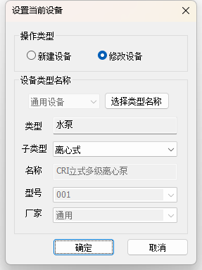 [操作类型] 分[新建设备]和[修改设备]两种。[新建设备]需要通过设置类型、名称、型号和厂家来新建一个库中不存在的新设备;[修改设备]需要通过点击[选择类型名称]进入库管理界面,选择一个已有的设备作为当前设备进行修改。