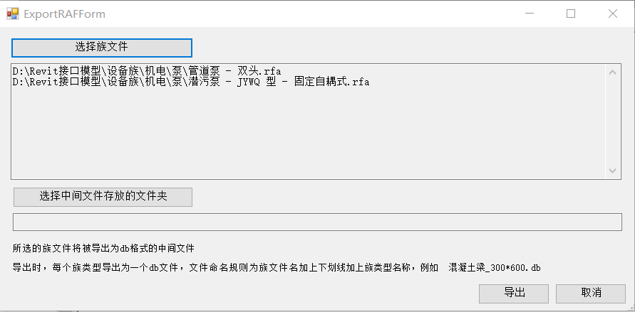 对每一个族文件的每一个族类型均会导出一个db文件,譬如选择了三个族文件,里面分别有1个族类型,2个族类型,5个族类型,最后导出的db文件个数为8个。