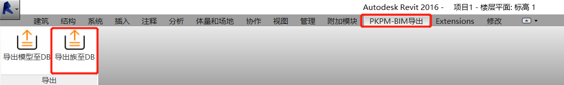 3.启动revit,会发现菜单栏多了一个菜单栏,里面有两个工具,其中一个是“导出族至DB”,如图16.9-3所示