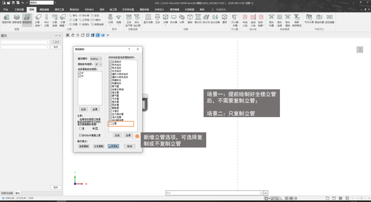 目录 搜索 展开 首页乘车路线版权与商标说明免责声明通用功能链接软件答疑与交流更新说明20262026 R1.22026 R1.12026 R1.020252025 R2.12025 R2.02025 R1.22025 R1.120242024 R2.22024 R2.12024 R2.02024 R1.42024 R1.32024 R1.22024 R1.12024 R1.020232023 R2.42023 R2.32023 R2.22023 R2.02023 R1.12023 R1.52023 R1.42023 R1.32023 R1.22023 R1.020222022 R3.12022 R3.02022 R2.32022 R2.22022 R2.12022 R2.02022 R1.42022 R1.32022 R1.22022 R1.0应用环境运行环境启动界面操作界面快速访问工具栏视图盒子模型操作视图区命令提示行项目浏览器属性面板多窗口显示设置视图工具条光照亮度三维坐标捕捉设置暖通专业设计暖通专业工程设置风系统设置水系统设置风管默认连接设置风管建模设置水管建模设置水管件默认设置风管材料设置水管材料设置地暖盘管材料设置二维设置空调风系统风管绘制风管编辑风立管风管连接件风管对齐风口布置风口连接静压箱换气扇、风机挡烟垂壁空调水系统水管绘制布空调立管多管绘制水管连接水管编辑风盘连水多联机系统室内机室外机多联机连管多联机分歧管采暖系统布散热器立干连接散立连接散干连接散散连接自动盘管手绘盘管盘管打断盘管合并布分集水器连分集水器设备及附件布置风盘水泵常用基础通用组合空调风阀消声器风管软连接水阀仪表角阀三通阀水管软接头组合阀暖通识图建模DWG编辑风管识图翻模水管识图建模风口识图翻模识别水阀仪表暖通标注风管标注风口标注管线文字水管标注立管标注出入户管标注管道坡度标注引出标注给排水专业设计给排水专业工程设置给排水系统设置管件默认设置给排水建模设置水管材料设置二维设置管道建模水管绘制多管绘制布水立管水管连接水管编辑水管连接件管道附件布置自动连接标准连接设备布置与连接卫浴布置卫浴连接水箱水泵基础集水坑排水沟室外设备通用消防系统建模消火栓系统布置与连接自动喷淋系统布置与连接气体灭火建模计算灭火器建模给排水识图建模消火栓识图建模消防喷淋系统水管识图建模水阀识图建模给排水标注管线文字水管标注立管标注出入户管标注喷头定位标注管道坡度标注引出标注电气专业设计电气专业工程设置线管系统设置桥架系统设置桥架默认连接件设置线管建模设置线管材料设置二维设置线管/桥架绘制桥架/线槽桥架布置桥架分支选择竖直桥架布置多层桥架桥架连接线管/导线线管布置竖直线管线管连接线管空间连接导线布置线管对齐强电系统设备灯具开关插座接线盒通用设备布置楼梯间布置防雷接地导体布置防雷布置接地布置弱电系统设备温烟感布置消防报警弱电通用综合布线变配电设备配电箱布置引出线管引出桥架配电箱系统检索变压器配电柜设备基础母线槽布置母线槽连接电缆沟设备连接设备连接连配电箱接口连接连接桥架电气专业计算区域照度计算防雷计算房间照度计算电气负荷计算电流计算负荷计算查看报告书电气专业标注引线布置灯具标注桥架标注导线标注标配电箱标水暖设备标导线数&根数修改设备标注回路标注&回路识别电气识图建模DWG处理工具电气设备点位桥架翻模设备库编辑设备库管理新建设备专业信息添加拆开设备整体缩放导入revit族组合设备库导入模型编辑过滤选择增强过滤器检查分支编辑水平设备标高分支标高分支选择坡度调整设备替换设备编号楼层归属删除重复拾取/刷新属性测量长度面积标高坐标支吊架布置支吊架布置支吊架延管拷贝支吊架沿线拷贝支吊架编号管线综合碰撞检查碰撞检查碰撞结果碰撞报告书管道编辑水暖空间搭接水暖局部调整线管局部调整桥架升降调整间距调整水管标准连接管道合并/打断水管对齐通用对齐管综平面图三维标注局部剖切专业协同合并工程净高分析净高设置净高平面净高检查水暖提资开洞提资任意布洞自动开洞开洞设置取消洞口开洞列表布置套管云协同材料统计材料统计统计结果清单生成清单样式清单结果支吊架统计模型审查审查流程全局属性智能审查通用工具设可见性查找构件选择过滤增强过滤测量工具基本建模模板标高机制机电专业标高机制构件复制 暂无相关搜索结果! 2022 R1.0 集成通用1.快捷命令2.对象捕捉优化3.锁定工作平面4.底图参照图层管理5.一号通登陆授权6.绿建插件包安装 机电专业1.风口管上布置优化2.水管绘制自动局部避让3.桥架上翻下翻4.喷淋连接末端自动处理5.机电构件自动开启锁定平面6.楼层复制补充立管选项7.【审查】自动喷水灭火系统喷水强度审查全局属性8.施工图设置9.施工图出图