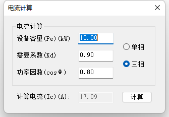 此功能采用需要系数法完成电流计算,全过程均在此对话框中完成。 在本对话框中的编辑框[额定功率(Pe)]、[需要系数(Kx)]、[功率因数(cos φ )]等几项需要手动输入数据,当确认无误后,再选择需要计算的相序是三项还是单项,二者的差别主要是计算电流的计算结果不同,而计算功率结果仍然是相同的 。