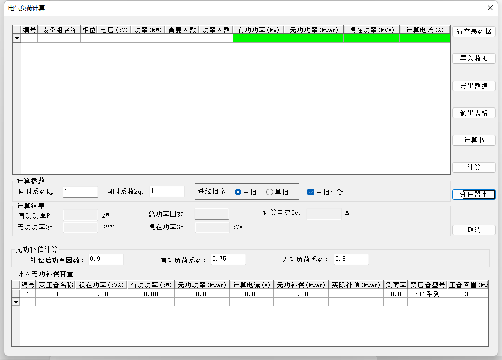 【补偿后功率因数】展开变压器按钮后,可设定该项参数,然后进行计入无功补偿容量的相关计算。