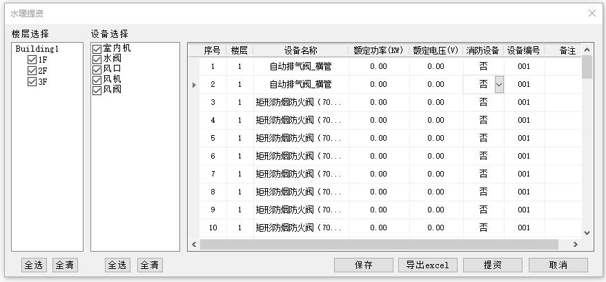 2.额定功率、额定电压、消防设备、设备编号和备注五项可在表格中直接编辑。