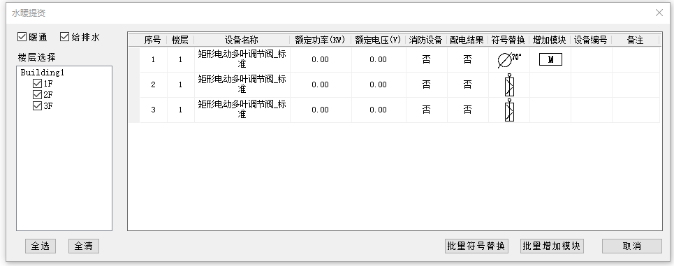 3.符号替换和增加模块两列表格点击分别会进入符号库模块。符号替换可将原暖通符号替换为电气动力符号,若不点击设置则默认读取原符号;增加模块可在设备符号上增加消防或其他模块,若不点击则无模块生成。生成模块位置如下图所示。