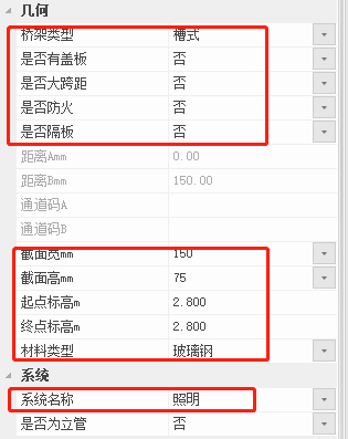 【选择分支】 亮显的桥架分支在属性栏可批量修改对应参数,包括属性如下图。当选择的桥架有不同属性时,属性栏会显示多种,修改此属性则亮显的桥架会统一调整为一种。