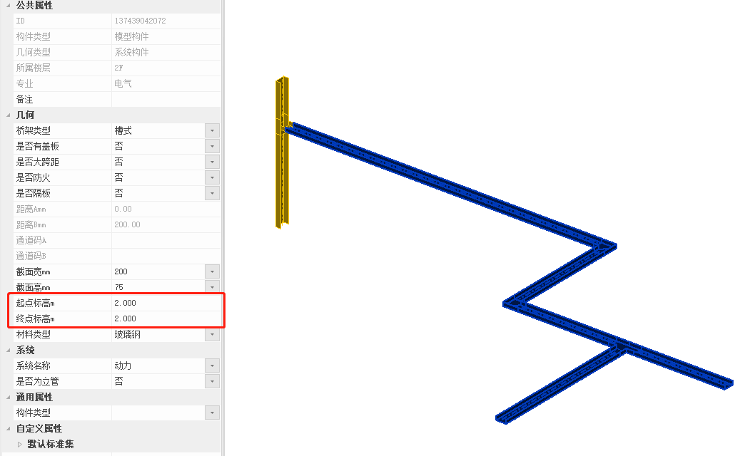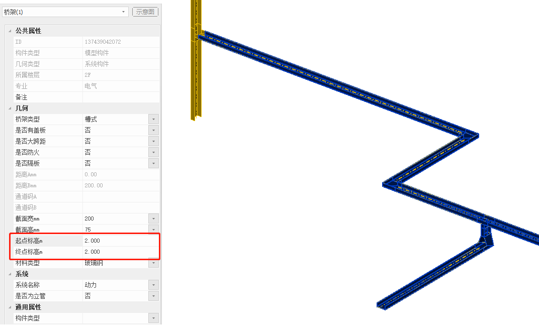 若桥架都是同一标高则整体调整。如下图选择分支后调整标高到2m,则蓝色部分都变成2m。