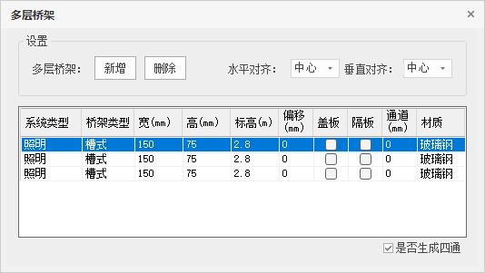 【是否生成四通】,勾选是否连接时,绘制时连接桥架,交叉时可生成四通。