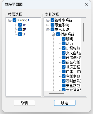 目录 搜索 展开 首页乘车路线版权与商标说明免责声明通用功能链接软件答疑与交流更新说明20262026 R1.22026 R1.12026 R1.020252025 R2.12025 R2.02025 R1.22025 R1.120242024 R2.22024 R2.12024 R2.02024 R1.42024 R1.32024 R1.22024 R1.12024 R1.020232023 R2.42023 R2.32023 R2.22023 R2.02023 R1.12023 R1.52023 R1.42023 R1.32023 R1.22023 R1.020222022 R3.12022 R3.02022 R2.32022 R2.22022 R2.12022 R2.02022 R1.42022 R1.32022 R1.22022 R1.0应用环境运行环境启动界面操作界面快速访问工具栏视图盒子模型操作视图区命令提示行项目浏览器属性面板多窗口显示设置视图工具条光照亮度三维坐标捕捉设置暖通专业设计暖通专业工程设置风系统设置水系统设置风管默认连接设置风管建模设置水管建模设置水管件默认设置风管材料设置水管材料设置地暖盘管材料设置二维设置空调风系统风管绘制风管编辑风立管风管连接件风管对齐风口布置风口连接静压箱换气扇、风机挡烟垂壁空调水系统水管绘制布空调立管多管绘制水管连接水管编辑风盘连水多联机系统室内机室外机多联机连管多联机分歧管采暖系统布散热器立干连接散立连接散干连接散散连接自动盘管手绘盘管盘管打断盘管合并布分集水器连分集水器设备及附件布置风盘水泵常用基础通用组合空调风阀消声器风管软连接水阀仪表角阀三通阀水管软接头组合阀暖通识图建模DWG编辑风管识图翻模水管识图建模风口识图翻模识别水阀仪表暖通标注风管标注风口标注管线文字水管标注立管标注出入户管标注管道坡度标注引出标注给排水专业设计给排水专业工程设置给排水系统设置管件默认设置给排水建模设置水管材料设置二维设置管道建模水管绘制多管绘制布水立管水管连接水管编辑水管连接件管道附件布置自动连接标准连接设备布置与连接卫浴布置卫浴连接水箱水泵基础集水坑排水沟室外设备通用消防系统建模消火栓系统布置与连接自动喷淋系统布置与连接气体灭火建模计算灭火器建模给排水识图建模消火栓识图建模消防喷淋系统水管识图建模水阀识图建模给排水标注管线文字水管标注立管标注出入户管标注喷头定位标注管道坡度标注引出标注电气专业设计电气专业工程设置线管系统设置桥架系统设置桥架默认连接件设置线管建模设置线管材料设置二维设置线管/桥架绘制桥架/线槽桥架布置桥架分支选择竖直桥架布置多层桥架桥架连接线管/导线线管布置竖直线管线管连接线管空间连接导线布置线管对齐强电系统设备灯具开关插座接线盒通用设备布置楼梯间布置防雷接地导体布置防雷布置接地布置弱电系统设备温烟感布置消防报警弱电通用综合布线变配电设备配电箱布置引出线管引出桥架配电箱系统检索变压器配电柜设备基础母线槽布置母线槽连接电缆沟设备连接设备连接连配电箱接口连接连接桥架电气专业计算区域照度计算防雷计算房间照度计算电气负荷计算电流计算负荷计算查看报告书电气专业标注引线布置灯具标注桥架标注导线标注标配电箱标水暖设备标导线数&根数修改设备标注回路标注&回路识别电气识图建模DWG处理工具电气设备点位桥架翻模设备库编辑设备库管理新建设备专业信息添加拆开设备整体缩放导入revit族组合设备库导入模型编辑过滤选择增强过滤器检查分支编辑水平设备标高分支标高分支选择坡度调整设备替换设备编号楼层归属删除重复拾取/刷新属性测量长度面积标高坐标支吊架布置支吊架布置支吊架延管拷贝支吊架沿线拷贝支吊架编号管线综合碰撞检查碰撞检查碰撞结果碰撞报告书管道编辑水暖空间搭接水暖局部调整线管局部调整桥架升降调整间距调整水管标准连接管道合并/打断水管对齐通用对齐管综平面图三维标注局部剖切专业协同合并工程净高分析净高设置净高平面净高检查水暖提资开洞提资任意布洞自动开洞开洞设置取消洞口开洞列表布置套管云协同材料统计材料统计统计结果清单生成清单样式清单结果支吊架统计模型审查审查流程全局属性智能审查通用工具设可见性查找构件选择过滤增强过滤测量工具基本建模模板标高机制机电专业标高机制构件复制 暂无相关搜索结果! 管综平面图 点击【管线综合】-【管综平面图】,主界面如下图所示。管综平面图功能可快速实现模型到管综平面图的快速生成,当前版本提供按楼层、按专业、分系统、分构件的筛选功能。 功能说明 【专业选择】 分暖通、给排水和电气三个专业可选。列表只显示与选中专业构件相关的内容。 【楼层选择】以建筑楼层为基准,列出所有楼层,勾选需要生成管综平面图的楼层。 【确定】 点击确定即可生成管综平面图。 新生成的管综平面图位置将在【视图集】-【管综平面图】下方生成。