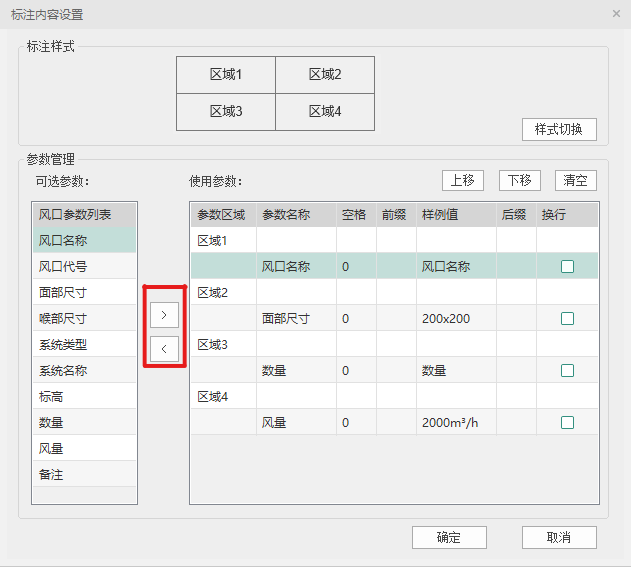 [标注内容设置]:单击标注内容设置按钮将启动二级对话框“标注内容设置”,如下图所示,可通过左右箭头设置各个区域中风口标注的参数;