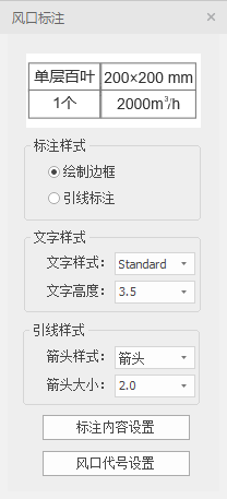 - 打开功能界面,风口标注功能可在二维视图或视图集或图纸集中拾取风口属性并进行标注。