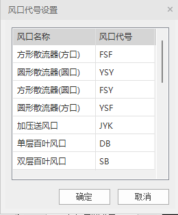 [风口代号设置]:单击风口代号设置按钮,将启动二级对话框“风口代号设置”,可设置不同类型风口的风口代号,在风口标注时如选择风口代号参数,将从此处读取风口代号参数;