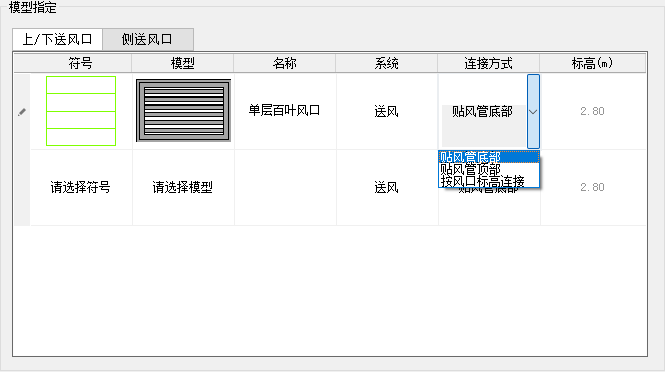 1、需要先确定风口的送风形式,上/下送风口或是侧送风口,上/下送风口需要确定好风口与风管的连接方式;侧送风口需要指定风口的高度。