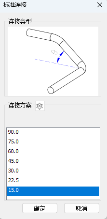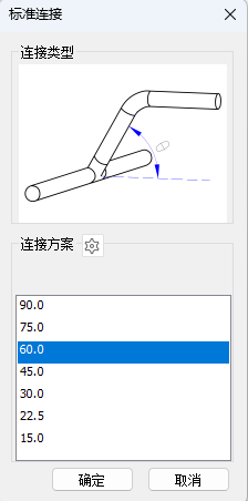 选择2根标高不同的管道后,能自动根据管道的位置关系,分别弹出对应的角度方案界面如下图所示: