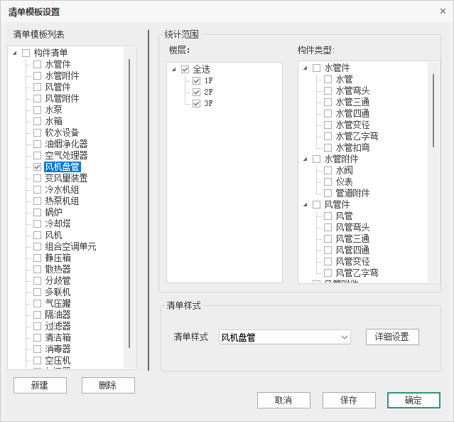 执行“清单生成”命令,弹出如下图所示的对话框。对话框中分【清单模板列表】、【统计范围】、【清单样式】和公共按钮个部分。