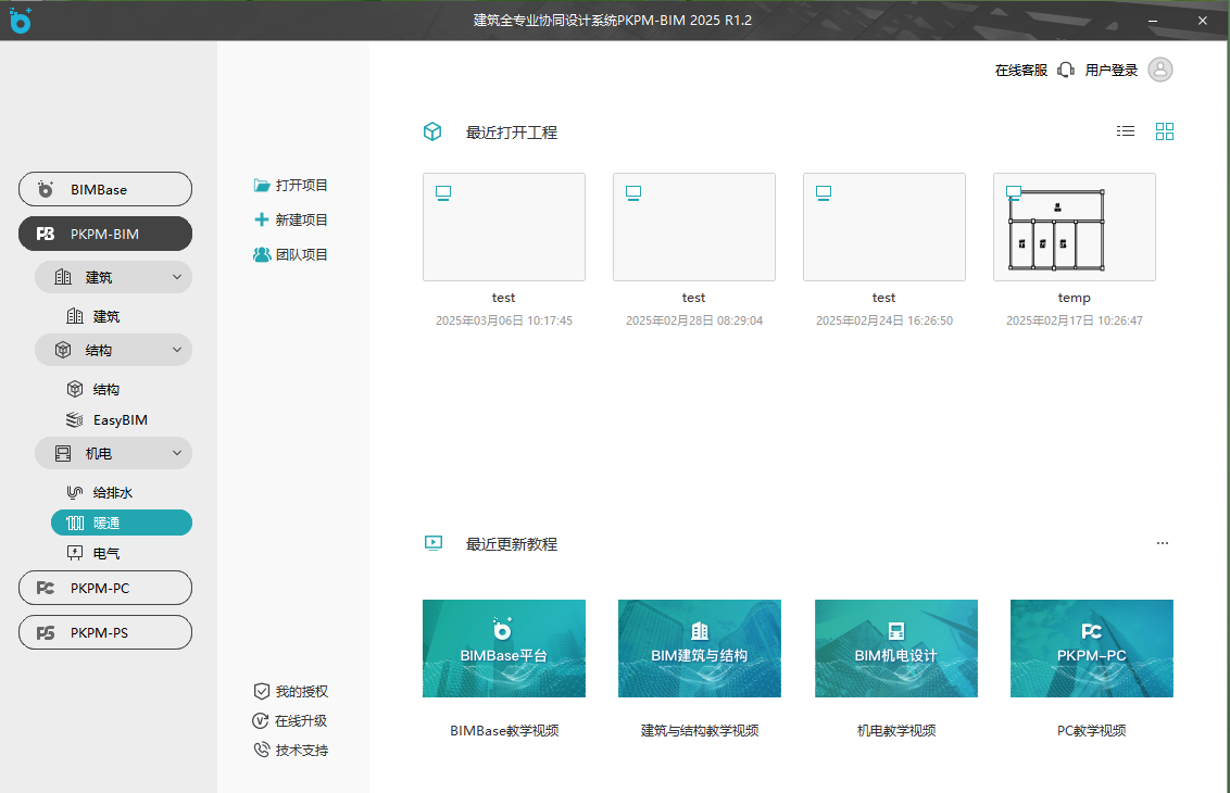 该界面是启动软件之后最先看到的界面,支持新建项目或打开现有项目。该界面左侧提供基于BIMBase平台的多款软件。展开PKPM-BIM后,可见“建筑”、“结构”、“机电”功能模块及其相关子部分,便于快速访问所需工具。
