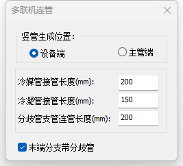 目录 搜索 展开 首页乘车路线版权与商标说明免责声明通用功能链接软件答疑与交流更新说明20262026 R1.22026 R1.12026 R1.020252025 R2.12025 R2.02025 R1.22025 R1.120242024 R2.22024 R2.12024 R2.02024 R1.42024 R1.32024 R1.22024 R1.12024 R1.020232023 R2.42023 R2.32023 R2.22023 R2.02023 R1.12023 R1.52023 R1.42023 R1.32023 R1.22023 R1.020222022 R3.12022 R3.02022 R2.32022 R2.22022 R2.12022 R2.02022 R1.42022 R1.32022 R1.22022 R1.0应用环境运行环境启动界面操作界面快速访问工具栏视图盒子模型操作视图区命令提示行项目浏览器属性面板多窗口显示设置视图工具条光照亮度三维坐标捕捉设置暖通专业设计暖通专业工程设置风系统设置水系统设置风管默认连接设置风管建模设置水管建模设置水管件默认设置风管材料设置水管材料设置地暖盘管材料设置二维设置空调风系统风管绘制风管编辑风立管风管连接件风管对齐风口布置风口连接静压箱换气扇、风机挡烟垂壁空调水系统水管绘制布空调立管多管绘制水管连接水管编辑风盘连水多联机系统室内机室外机多联机连管多联机分歧管采暖系统布散热器立干连接散立连接散干连接散散连接自动盘管手绘盘管盘管打断盘管合并布分集水器连分集水器设备及附件布置风盘水泵常用基础通用组合空调风阀消声器风管软连接水阀仪表角阀三通阀水管软接头组合阀暖通识图建模DWG编辑风管识图翻模水管识图建模风口识图翻模识别水阀仪表暖通标注风管标注风口标注管线文字水管标注立管标注出入户管标注管道坡度标注引出标注给排水专业设计给排水专业工程设置给排水系统设置管件默认设置给排水建模设置水管材料设置二维设置管道建模水管绘制多管绘制布水立管水管连接水管编辑水管连接件管道附件布置自动连接标准连接设备布置与连接卫浴布置卫浴连接水箱水泵基础集水坑排水沟室外设备通用消防系统建模消火栓系统布置与连接自动喷淋系统布置与连接气体灭火建模计算灭火器建模给排水识图建模消火栓识图建模消防喷淋系统水管识图建模水阀识图建模给排水标注管线文字水管标注立管标注出入户管标注喷头定位标注管道坡度标注引出标注电气专业设计电气专业工程设置线管系统设置桥架系统设置桥架默认连接件设置线管建模设置线管材料设置二维设置线管/桥架绘制桥架/线槽桥架布置桥架分支选择竖直桥架布置多层桥架桥架连接线管/导线线管布置竖直线管线管连接线管空间连接导线布置线管对齐强电系统设备灯具开关插座接线盒通用设备布置楼梯间布置防雷接地导体布置防雷布置接地布置弱电系统设备温烟感布置消防报警弱电通用综合布线变配电设备配电箱布置引出线管引出桥架配电箱系统检索变压器配电柜设备基础母线槽布置母线槽连接电缆沟设备连接设备连接连配电箱接口连接连接桥架电气专业计算区域照度计算防雷计算房间照度计算电气负荷计算电流计算负荷计算查看报告书电气专业标注引线布置灯具标注桥架标注导线标注标配电箱标水暖设备标导线数&根数修改设备标注回路标注&回路识别电气识图建模DWG处理工具电气设备点位桥架翻模设备库编辑设备库管理新建设备专业信息添加拆开设备整体缩放导入revit族组合设备库导入模型编辑过滤选择增强过滤器检查分支编辑水平设备标高分支标高分支选择坡度调整设备替换设备编号楼层归属删除重复拾取/刷新属性测量长度面积标高坐标支吊架布置支吊架布置支吊架延管拷贝支吊架沿线拷贝支吊架编号管线综合碰撞检查碰撞检查碰撞结果碰撞报告书管道编辑水暖空间搭接水暖局部调整线管局部调整桥架升降调整间距调整水管标准连接管道合并/打断水管对齐通用对齐管综平面图三维标注局部剖切专业协同合并工程净高分析净高设置净高平面净高检查水暖提资开洞提资任意布洞自动开洞开洞设置取消洞口开洞列表布置套管云协同材料统计材料统计统计结果清单生成清单样式清单结果支吊架统计模型审查审查流程全局属性智能审查通用工具设可见性查找构件选择过滤增强过滤测量工具基本建模模板标高机制机电专业标高机制构件复制 暂无相关搜索结果! 多联机连管 点击【建模】-【多联机】-【多联机连管】,多联机连管界面如下图所示。 操作说明 打开功能界面,设置好水管接管长度和分歧管支管连管长度;选择竖管生成位置,可以选择在设备端或者在主管端;根据需要,勾选末端是否要带分歧管;框选目标室内机和管道,鼠标位置为分歧管流向位置,右键完成连接。 功能说明 【冷媒管接管长度】冷媒管接管长度伸出设备的距离。 【冷凝管接管长度】冷凝管伸出设备的距离。 【分歧管支管连管长度】分歧管支管连管长度。