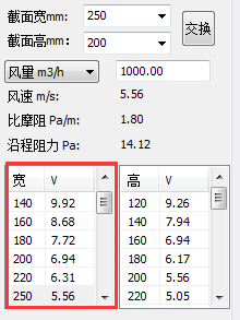 【截面宽对应风速列表】 次列表将在当前截面宽和风量状态下的,不同截面宽及对应的风速显示出,方便查询与选择。且选择列表中的宽尺寸可联动到当前截面宽尺寸。例如图表5.1.1-4中,截面宽对应风速列表显示的为在当前高(200)和风量(1000)的状态下,个宽度尺寸对应的风速。在列表中选择截面宽(320),则联动到当前截面宽尺寸,且实时计算对应的风速、比摩阻和沿程阻力,沿程阻力在绘制风管时根据风管的长度动态显示。[截面高对应风速列表]与此功能相同。