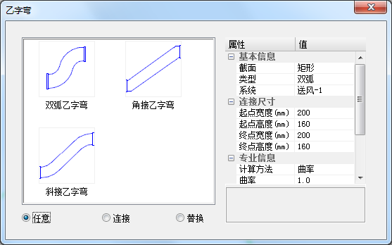 风管乙字弯界面如所示,可在左侧图示列表中选择乙字弯类型,右侧列表中为所选乙字弯参数。