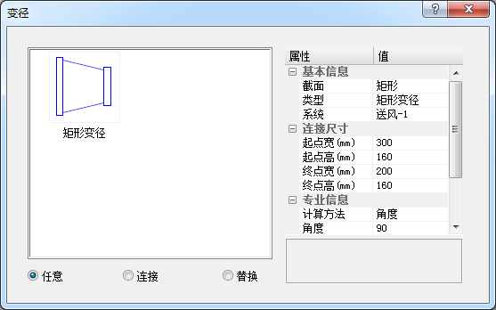 风管变径界面如所示,可在左侧图示列表中选择变径类型,右侧列表中为所选变径参数。